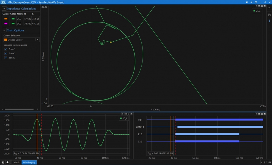 어드미턴스(mho) 원 선도와 알파 평면(alpha plane) 기능을 통해 보호 계전기의 차동 및 거리 보호 요소가 고장 상황에서 어떻게 반응했는지 상세히 분석할 수 있습니다. -