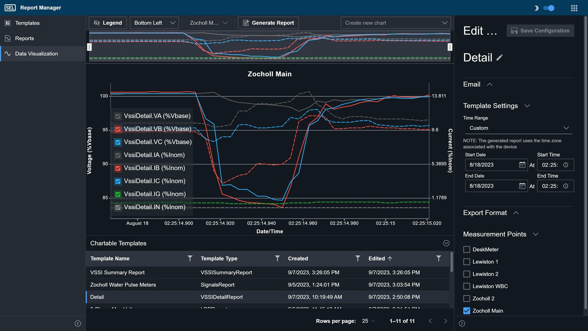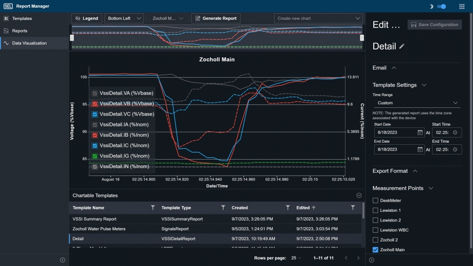 전압 처짐/부풀음/중단(VSSI), 부하 프로파일 데이터(LDP), WAGES(물, 공기, 가스, 전기, 증기) 소비 데이터 및 순차 이벤트 기록(SER) 데이터를 통합하여 시각화합니다. -